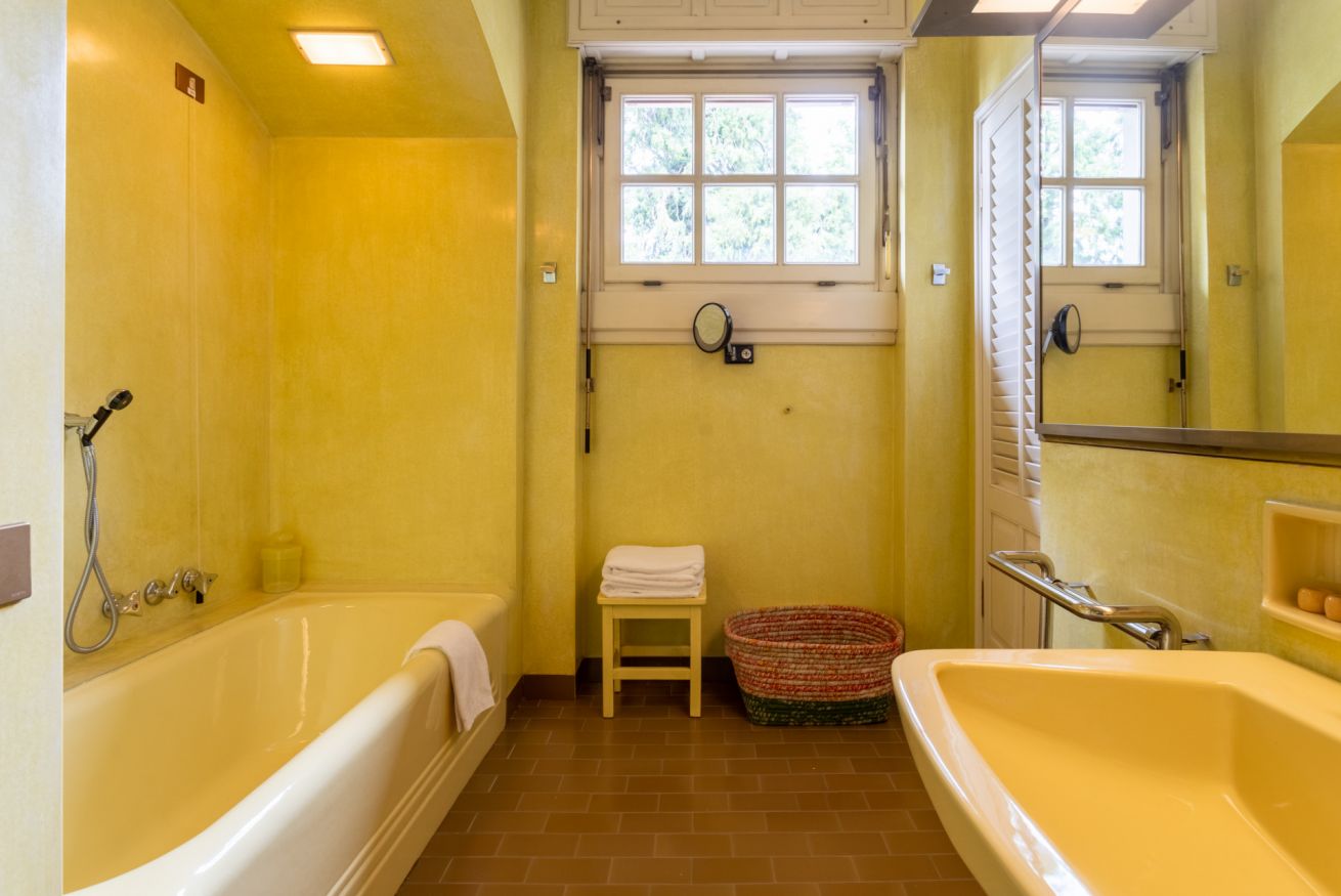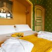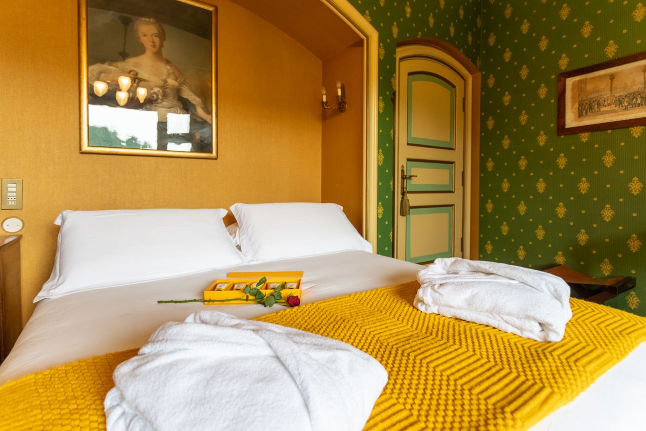 Spaziosa ed elegante camera di circa 40mq con vista giardino e balcone privato, arredata con mobili d'antiquariato, stoffe e rifiniture stile impero e pavimenti in parquet.